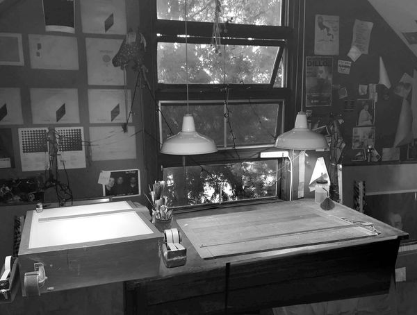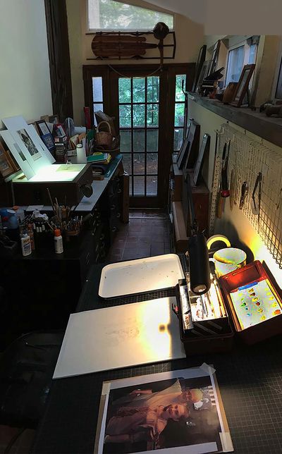 A few years later, that studio became a reality when the brilliant and colorful carpenter, John Burgund (AKA Captain Beyond) walled off a third of the space for an insulated and electronically wired studio. He added book shelves, storage space cabinets, hanging light fixtures and a large, louvered window that looked out at the pond. We installed a big desk, some filing cabinets, and a custom made light box, courtesy of the Captain.