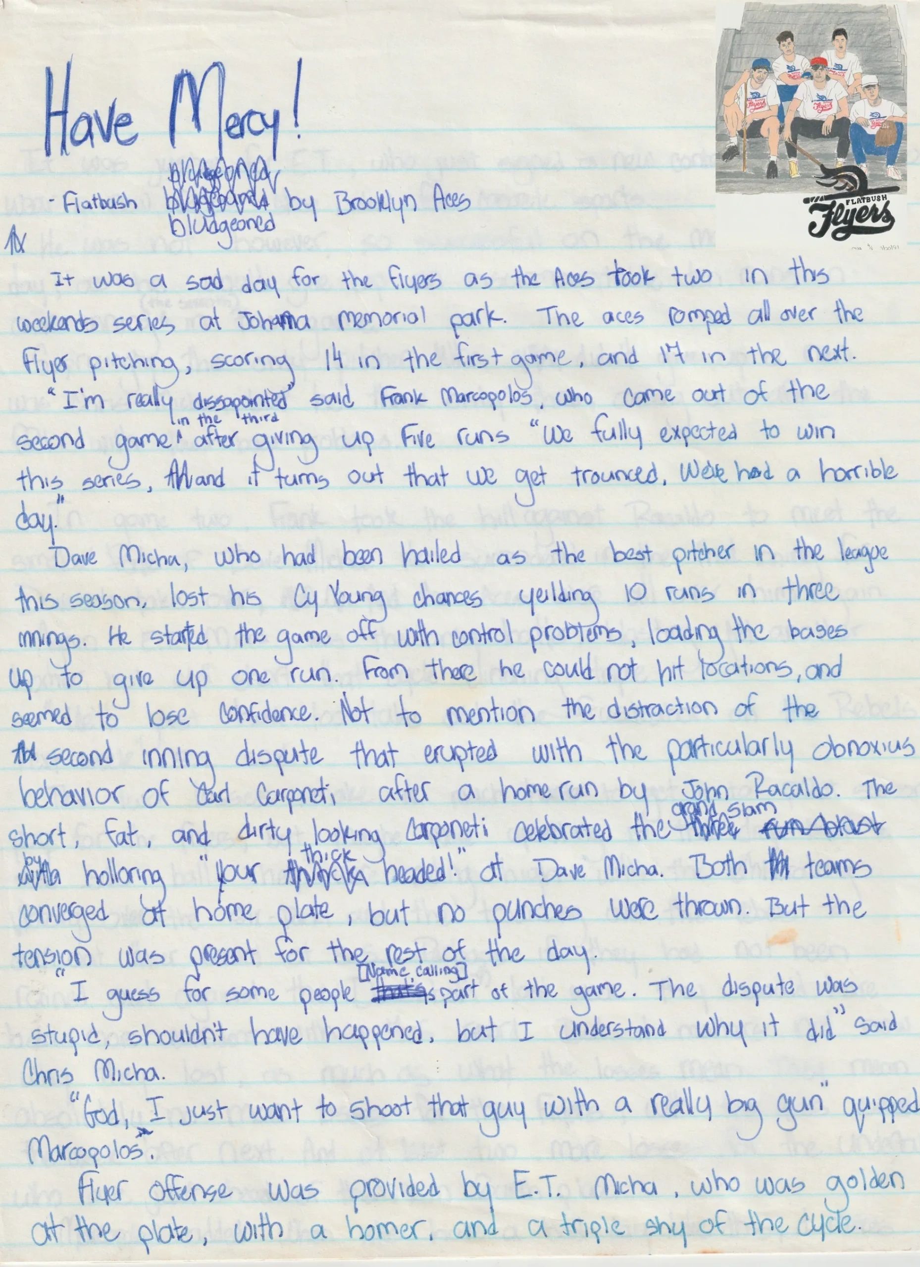 In the early ‘90’s the Micha brothers, with their pals, Frank Marcopolis and Russell Methle, played in an organized stick ball league. The “Flatbush Flyers” team statistics and W-L record was meticulously recorded by 16-year old CDM. He also produced an illustrated team newsletter, reporting in amusing anecdotal fashion, their highs and lows.
